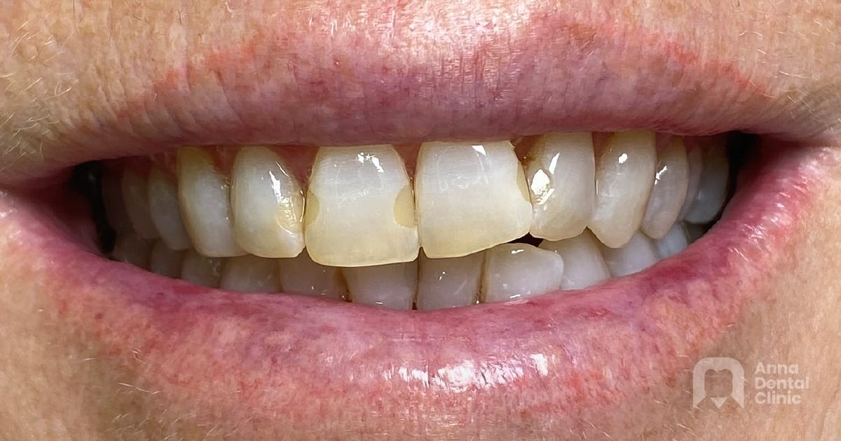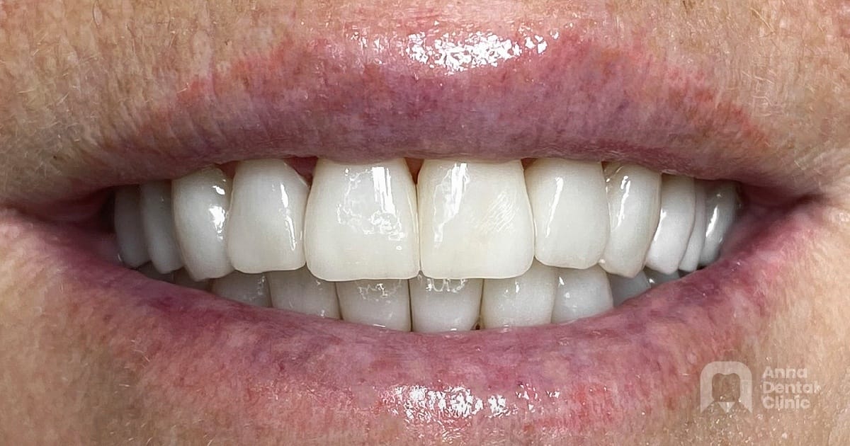 Pacjenta trafiła do naszej kliniki z dużą ilością nieestetycznych wybarwień i wypełnień uzębienia, które okresowo musiała wymieniać. Pani Kristina marzyła o pięknym naturalnie wyglądającym uśmiechu. Wykonaliśmy licówki porcelanowe w zębach górnych i dolnych oraz oraz korony częściowe i only-e Emax na zęby boczne.